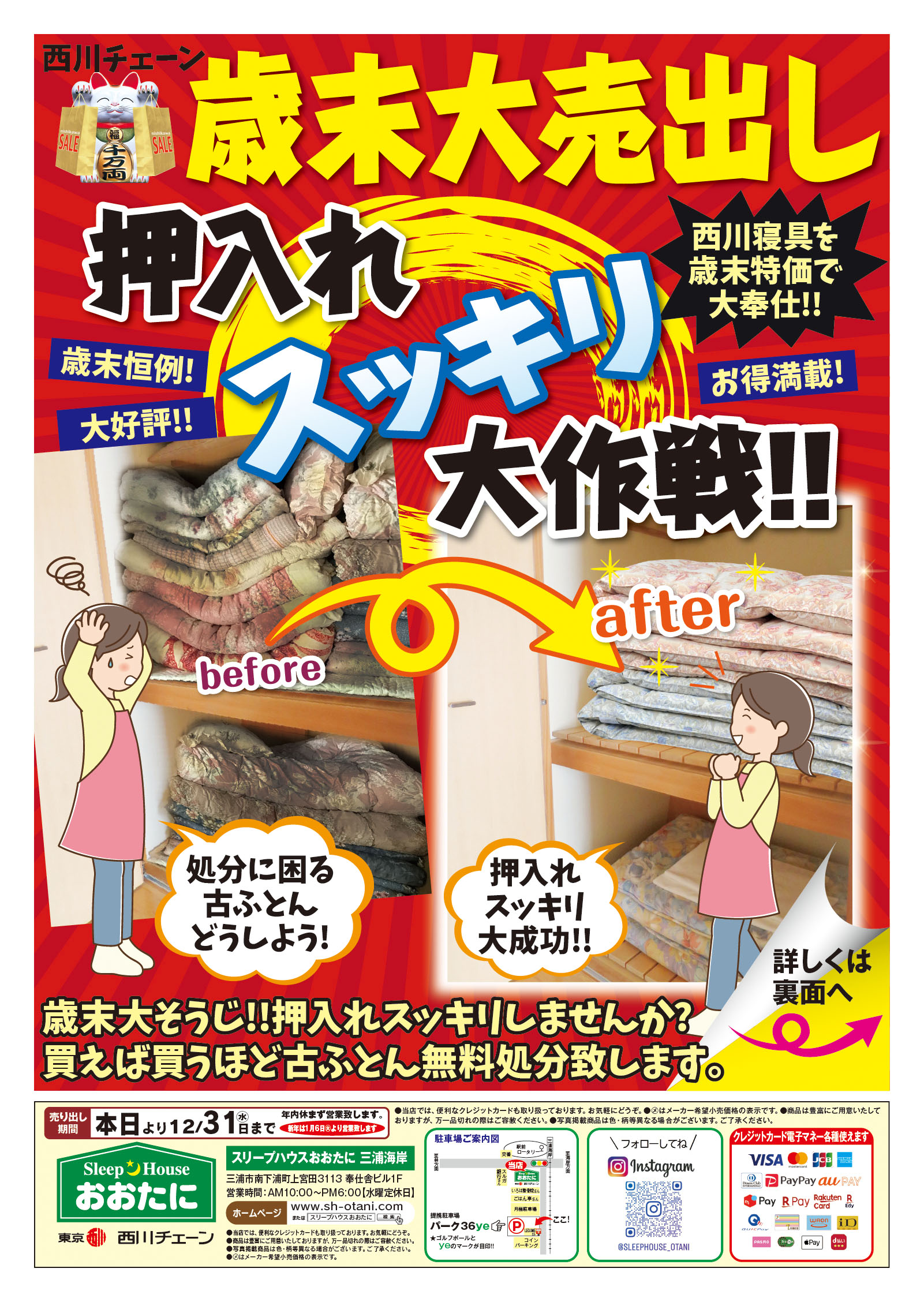 スリープハウスおおたには、 神奈川県横須賀市、三浦市で唯一の東京西川チェーン寝具専門店です。寝具専門店ならではのオーダー枕や品質確かな羽毛ふとん、寝心地の選べる敷き布団などの寝具から、パジャマやインテリア小物まで季節に合わせたアイテムを豊富に取り揃えております。 お布団のクリーニングや仕立て直しなどアフターケアもお任せください。