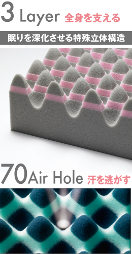 AIRのウレタンの通気を促進する70個の通気孔が、湿気や汗を拡散・放湿。冬はあたたか、夏はさわやかにご使用いただけます。