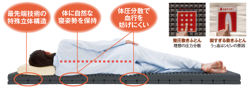 整圧敷きふとんは、仰向け・横向きとも、体への圧迫が少ない構造になっています。
